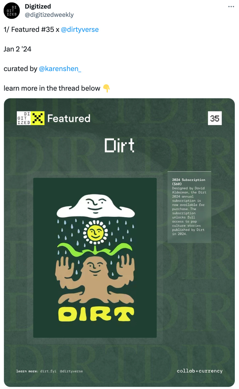 Dirt (🤝) / 2024 Subscriptions — The 2024 Dirt subscription is now live and offers access to all paywalled content and includes art by David Alderman. The team worked with Privy, Unlock Protocol, and Base to build a strong UX for readers that lives on web3 rails — more