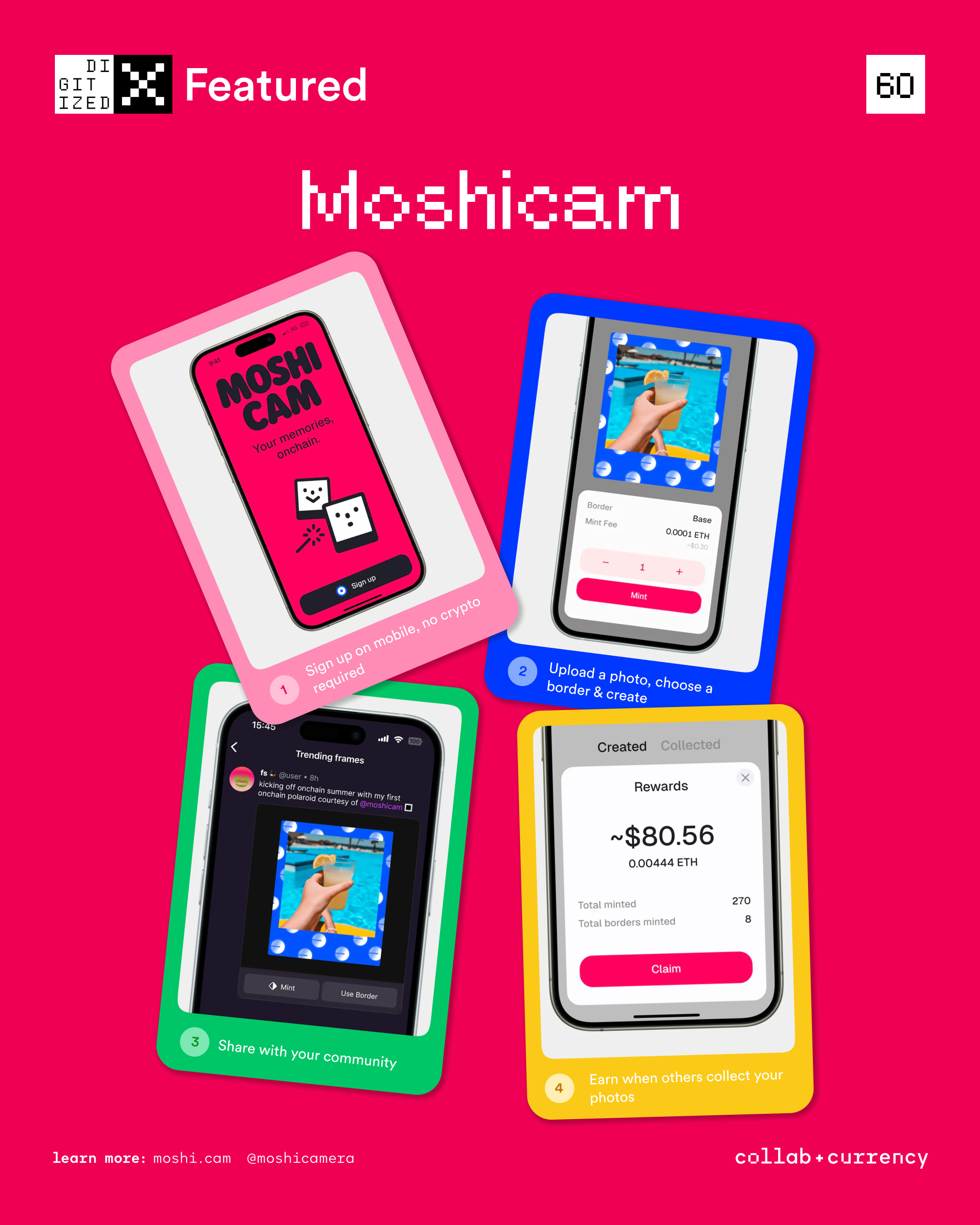 Moshicam is where your memories and photos live onchain as collectibles. Created by the same team behind Gallery.